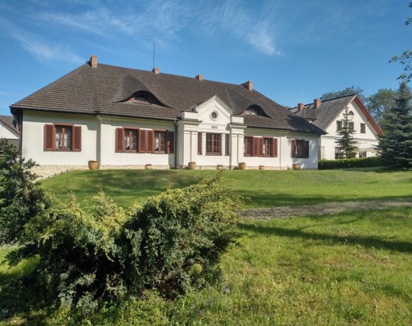 powstał na fundamentach lub obrysach budynków zabytkowego zespołu dworskiego Strużyńskich z 1861 r.